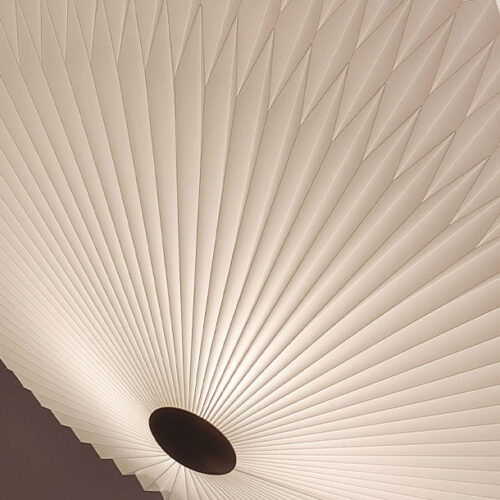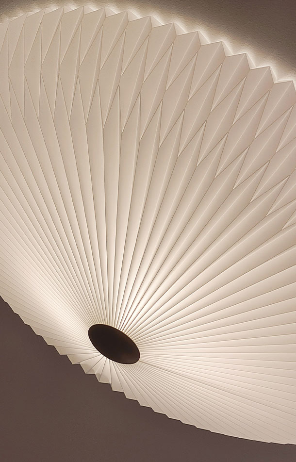 日本の折り紙にも影響を受けた、伝統の直線が美しいシリーズです。規則的に続く折りは美しい陰影を生み出し、レ・クリントの原点となっています。シェードは創業時から変わらず現在もデンマークの工房で熟練した折り職人によってひとつひとつ丁寧につくられています。