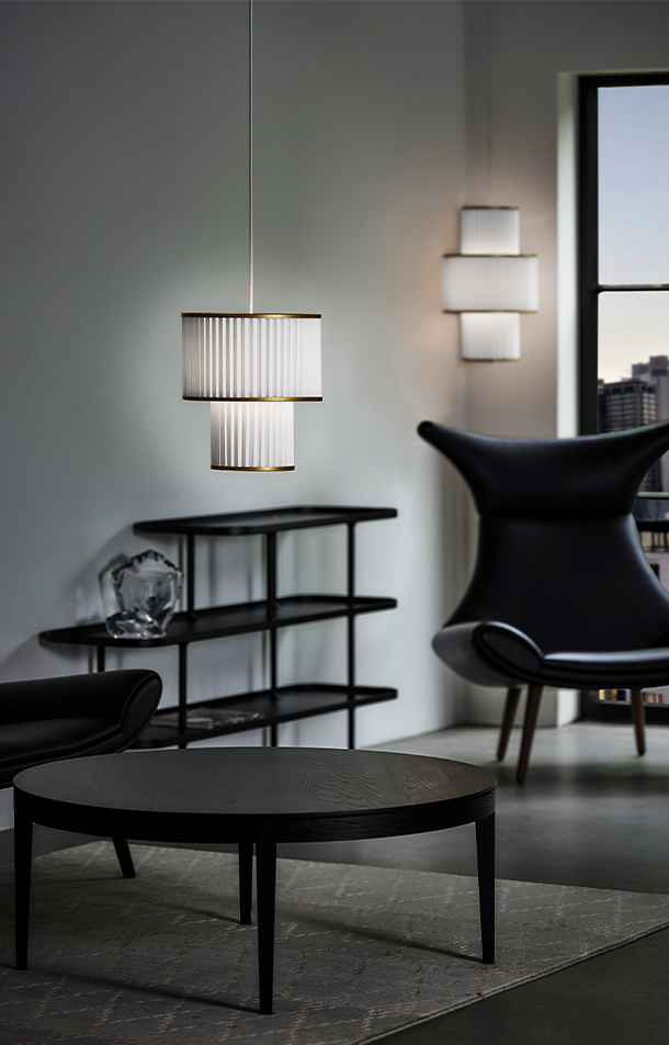 日本の折り紙にも影響を受けた、伝統の直線が美しいシリーズです。規則的に続く折りは美しい陰影を生み出し、レ・クリントの原点となっています。シェードは創業時から変わらず現在もデンマークの工房で熟練した折り職人によってひとつひとつ丁寧につくられています。