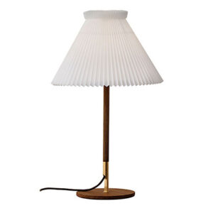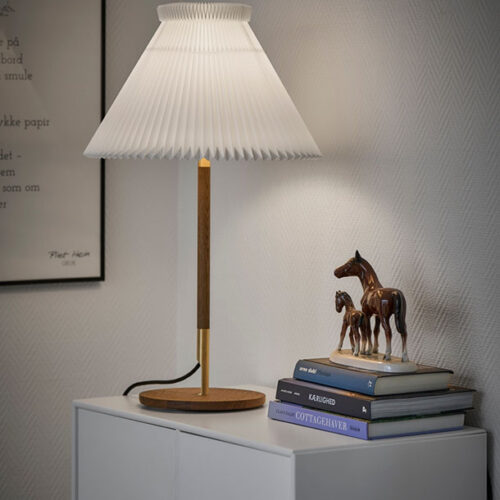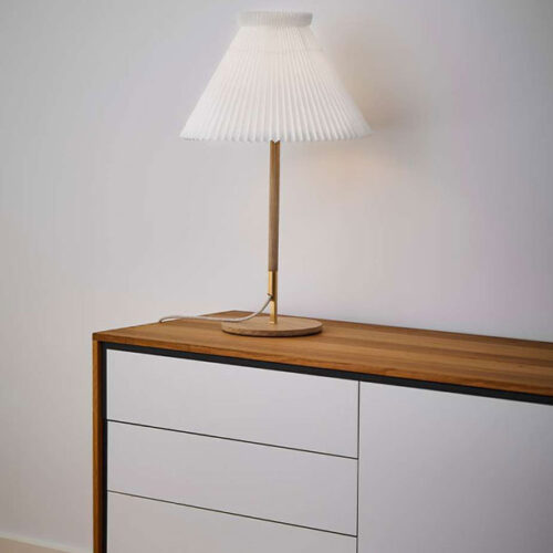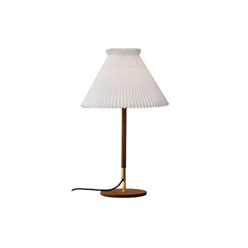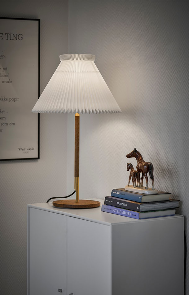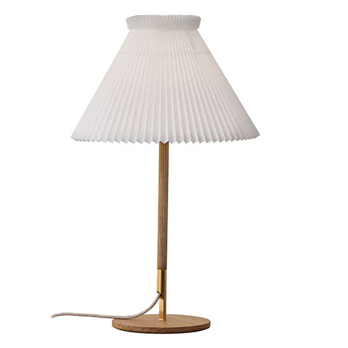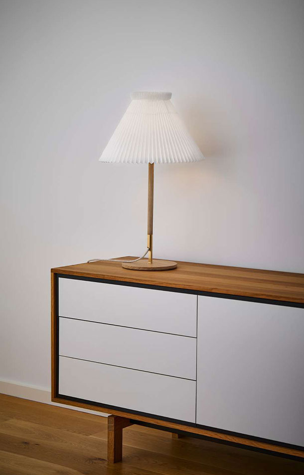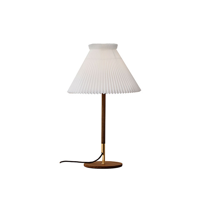 レ・クリント創業80周年を記念して誕生したモデル328。レ・クリントのクラシックなプリーツシェードのランプをベースにデザインされたこのシリーズは、洗練されたシンプルな構造で、伝統的なデザインにオーク材の支柱脚部に取り付けられた真鍮のディテールがモダンなアクセントとなった北欧らしいランプです。