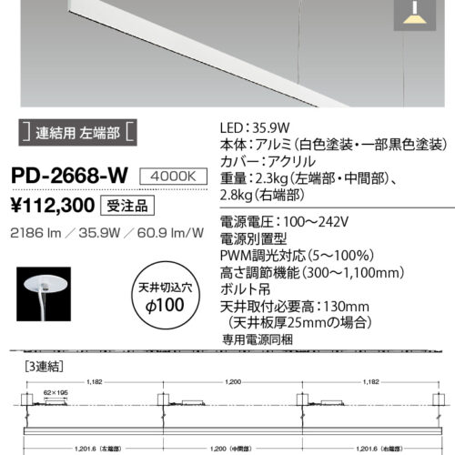 | 説明文 | 取付方法:工事 切込穴寸法:φ100mm 光色(LED):白色 色温度(K):4000K 演色性(Ra):Ra83 LEDタイプ:LED一体型 従来光源相当:FHF32W相当 調光:PWM調光 光源仕様:LED 35.9W 寸法:幅1201.6×16mm・高64mm 重量:2.3kg 材質仕上:本体:アルミ(白色塗装・一部黒色塗装)/カバー:アクリル 電圧:100V〜242V 定格光束(LED):2186lm 消費電力(LED):35.9W 固有エネルギー消費効率(LED):60.9lm/W LEDモジュール寿命:40000 Line type 電源電圧100〜242V 電源別置型 専用電源同梱 連結用左端部 PWM調光対応(5〜100%) 高さ調節機能(300〜1100mm) |