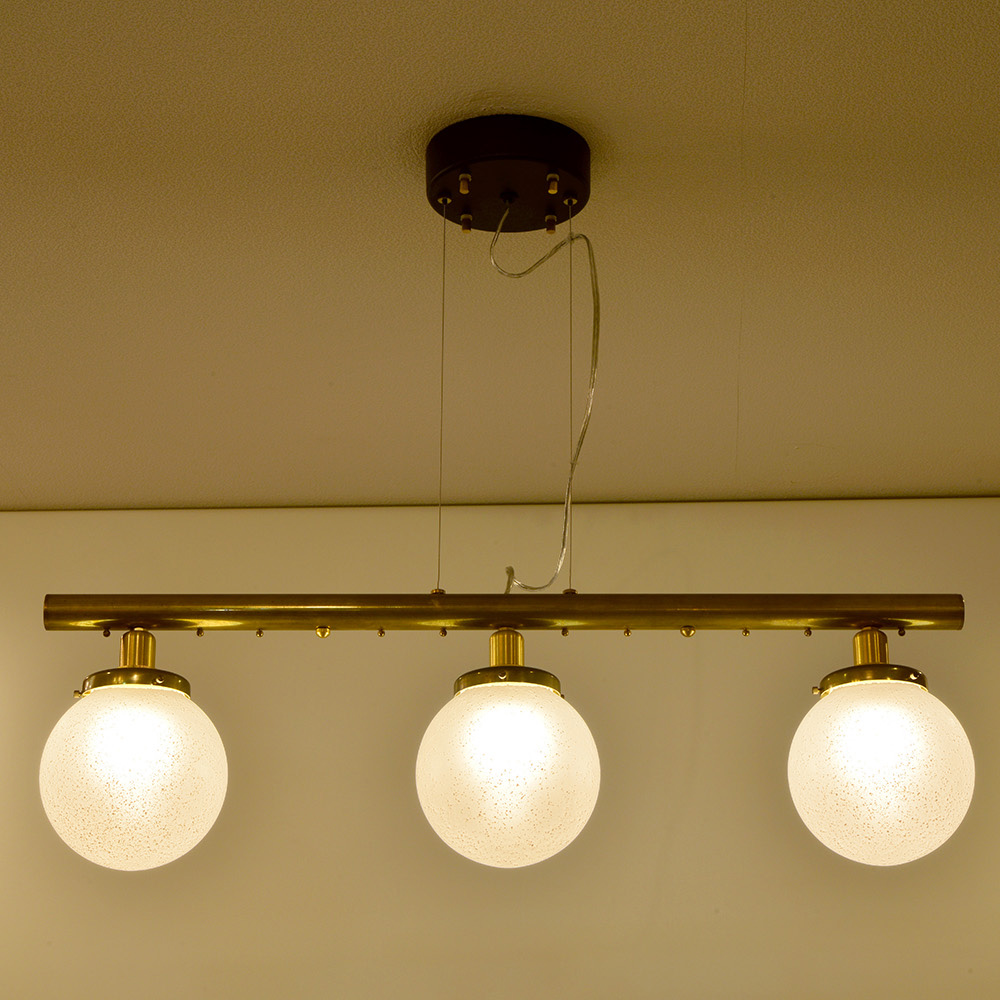 | 説明文 | 室内専用器具 高:230mm /幅:780mm / 重さ:3.0kg / 全長:1500〜450mm調節可能 セード:ガラス(スカボ) フレンジ:真鍮 真鍮の色合いが写真と異なる場合がございます。基本は明るい真鍮生地色となります。 |