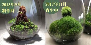 2013年制作のホソバオキナゴケの作品は、LEDの光と水の調整で成長しつづけています。自然光のない場所でも、LEDの光を1日8時間点灯、水は週に1~2回の霧吹きで成長します。電気代は1か月45円程度です。