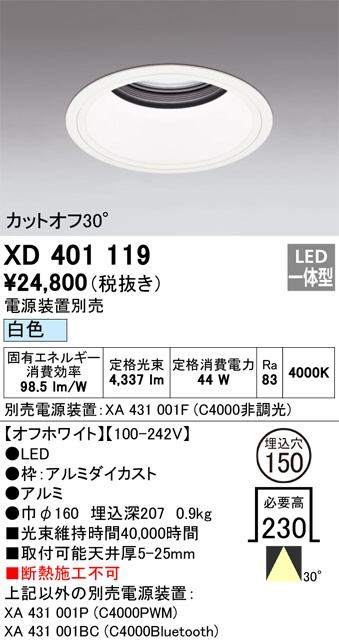 XD401119 オーデリック LEDダウンライト 電源装置別売 (代引き不可)