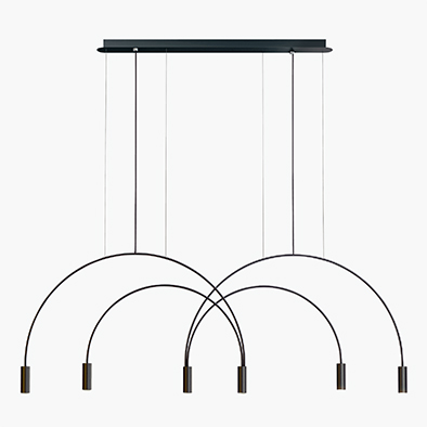 ヴォルタはアレクサンダー・カルダーのモビールを想起させるサスペンションライト。繊細で軽やかなアーチ状のデザインは、空間に圧迫感を感じさせずにテーブル全体をドラマチックに照らします。豊富なバリエーションによってさまざまな長さのテーブルに対応する最適なサイズをコーディネートできます。