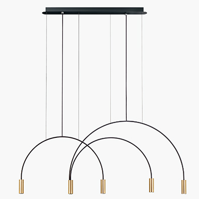 ヴォルタはアレクサンダー・カルダーのモビールを想起させるサスペンションライト。繊細で軽やかなアーチ状のデザインは、空間に圧迫感を感じさせずにテーブル全体をドラマチックに照らします。豊富なバリエーションによってさまざまな長さのテーブルに対応する最適なサイズをコーディネートできます。