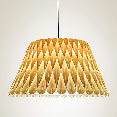 ローラは薄い天然木を複雑に組み合わせて作られた、幾何学模様のシェードが美しいペンダント照明です。光が灯ると木の重なりや木目のディテールはリズミカルな表情を見せ、モダンな装いの中にも温かみのある風合いが空間を豊かに演出します。