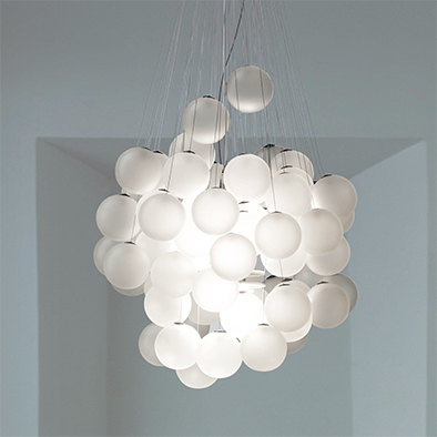 ストキャスティックは、雲を成すように集められたガラスの球体が内側からの光を反射することで、ひとつの光の彫刻のような存在感を空間にもたらします。伝統的なクリスタルシャンデリアがシンメトリーな形である一方、ストキャスティックは球体をランダムに構成している、表情ゆたかな現代のシャンデリアです。