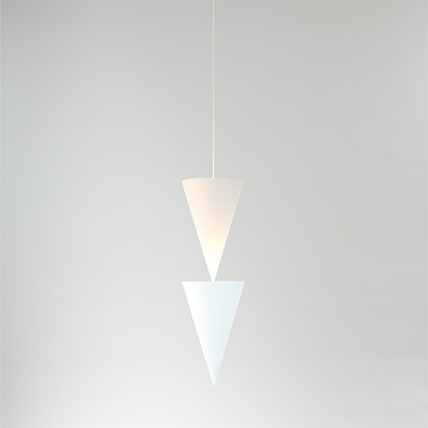 シンプルな幾何学形態で、彫刻のような作品をデザインするマイケル・アナスタシアデスの新作照明ピークス。連なる円錐が山の峰々を連想させるペンダントシリーズです。特徴的なフォルムだけでは無く、円錐の曲面に沿った美しい光のグラデーションも計算されたデザインの一部です。消灯時と点灯時で、異なる2つの表情を楽しめます。セードはアップとダウン、数もシングルからトリプルまでバリエーションを揃えています。