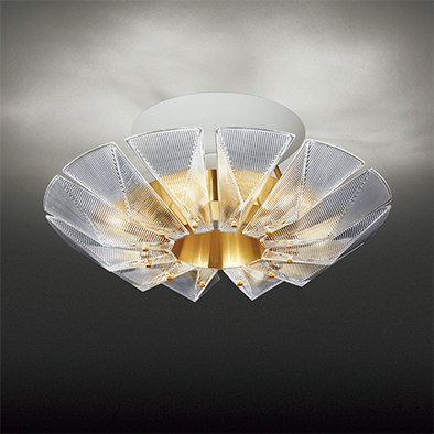 フィオーレは、内側にプリズムカットしたクリアのプレスガラスをリング状に並べたデザインが特徴です。折り紙のようなシャープなエッジラインが連続し、煌き感のあるモダンなシャンデリアです。
