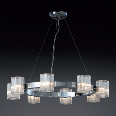 フレアは、10世紀頃に教会を中心として発達したクラシックシャンデリアの一つ、リングの周りに蝋燭を配したロマネスク様式をモダンに解釈したシャンデリア。独特の味わいがあるプレスガラス製のセードを通る光は、空間に重厚な輝きを放ちます。