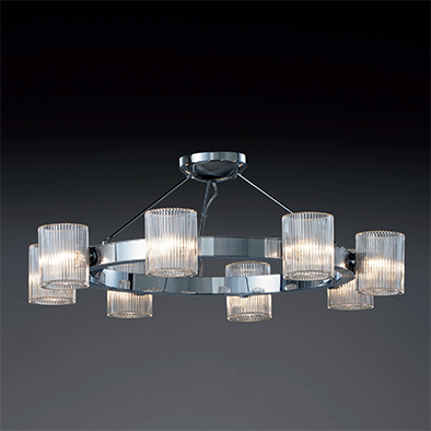 フレアは、10世紀頃に教会を中心として発達したクラシックシャンデリアの一つ、リングの周りに蝋燭を配したロマネスク様式をモダンに解釈したシャンデリア。独特の味わいがあるプレスガラス製のセードを通る光は、空間に重厚な輝きを放ちます。