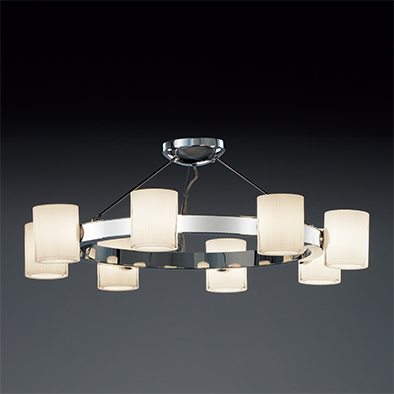 フレアは、10世紀頃に教会を中心として発達したクラシックシャンデリアの一つ、リングの周りに蝋燭を配したロマネスク様式をモダンに解釈したシャンデリア。独特の味わいがあるプレスガラス製のセードを通る光は、空間に重厚な輝きを放ちます。