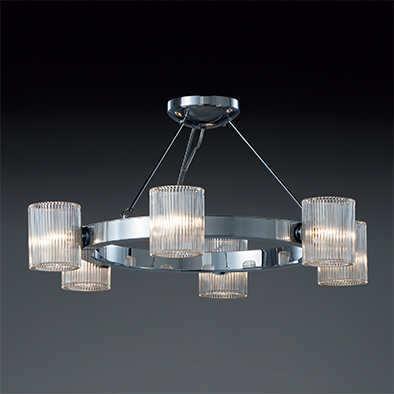 フレアは、10世紀頃に教会を中心として発達したクラシックシャンデリアの一つ、リングの周りに蝋燭を配したロマネスク様式をモダンに解釈したシャンデリア。独特の味わいがあるプレスガラス製のセードを通る光は、空間に重厚な輝きを放ちます。