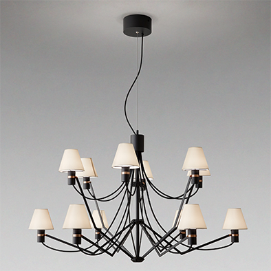 コンストラクションは、繊細なアームをワイヤーのテンションで保持し、本体とコードの懸垂曲線によるシルエットで空間を構成するシャンデリアです。独自の組み立て構造により軽量でありながらシャンデリアとしてのボリューム感を持ち、天井に吊るすことで折りたたまれたアームが展開します。