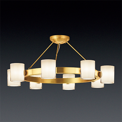 フレアは、10世紀頃に教会を中心として発達したクラシックシャンデリアの一つ、リングの周りに蝋燭を配したロマネスク様式をモダンに解釈したシャンデリア。独特の味わいがあるプレスガラス製のセードを通る光は、空間に重厚な輝きを放ちます。