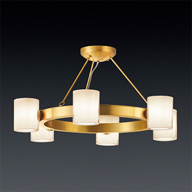 フレアは、10世紀頃に教会を中心として発達したクラシックシャンデリアの一つ、リングの周りに蝋燭を配したロマネスク様式をモダンに解釈したシャンデリア。独特の味わいがあるプレスガラス製のセードを通る光は、空間に重厚な輝きを放ちます。