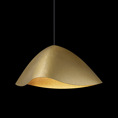 フワリは、光がふんわりと浮かんでいる風景を思い浮かべデザインしました。内側にくるんと巻いた独特のカーブは、逐次成形という特殊な製法により偶然生まれたもの。真鍮とアルミ、素材によって巻き方が異なり、さらに三角形という形状から、見る角度によって表情が変わります。1灯で住宅の食卓の上にも使え、多灯でホテルの吹き抜けエントランスにも使えるような、どんなシチュエーションでもアレンジして使えます。