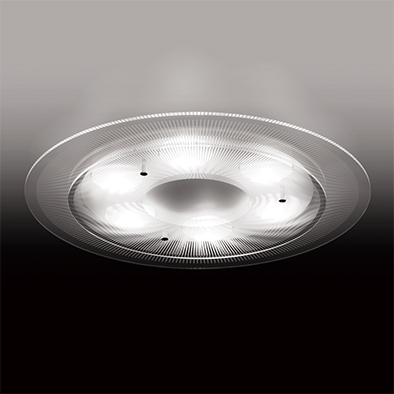 LEDシーリングライトは、放射状に白いラインを印刷した透明アクリルを2枚重ねあわせ、美しいモアレ模様を描いています。本体の仕上げはステンレス磨き仕上げと白塗装のタイプがあり、その違いにより映り込むモアレ模様の印象が異なります。
