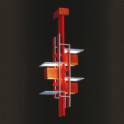 タリアセンペンダントは、1933年、ライトがタリアセン敷地内のヒルサイド・ホーム・スクール(1902年)の体育館を劇場に改装した際に生まれた照明器具です。劇場の高い天井から吊り下げられた照明器具は、四角い木製のボックスと積層材の遮光板によって構成され、ゆたかな直接光と間接光を放っています。ガラスやシェードを用いずに、木製のボックスと遮光板で巧みに光を制御しています。