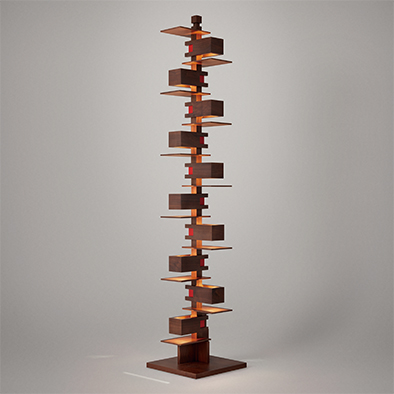 フランク・ロイド・ライトは、間接光の美しさに魅了され、自身が設計した米国ウィスコンシン州のタリアセンの劇場のために、木製のボックスと遮光板で構成したペンダント照明をデザインして以来、さまざまな空間にあわせて、光の彫刻のように、同様のデザインを応用しました。タリアセンは当時、置かれる空間に合わせ最適な大きさで作られ、さらに、それぞれの土地で地元の木材を使用していました。現在はチェリー、ウォルナット、チェスナット、オークの木材と3つのサイズバリエーションが揃います。