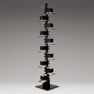 フランク・ロイド・ライトは、間接光の美しさに魅了され、自身が設計した米国ウィスコンシン州のタリアセンの劇場のために、木製のボックスと遮光板で構成したペンダント照明をデザインして以来、さまざまな空間にあわせて、光の彫刻のように、同様のデザインを応用しました。タリアセンは当時、置かれる空間に合わせ最適な大きさで作られ、さらに、それぞれの土地で地元の木材を使用していました。ブラックエディションは、ライトのお気に入りの色であるチェロキーレッドも無い黒の単色。バランスのとれた幾何学的なシルエットがさらに際立ちます。光と影が織り成すコントラストの美しさは勿論、消灯時においても抽象彫刻のようなフォルムは、空間に圧倒的な存在感を放ちます。