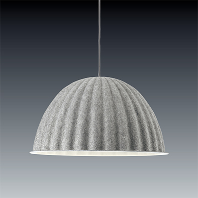 アンダー・ザ・ベルは、ダイニングテーブルの上でも広い空間の天井からでも、吊るだけでその場の空気を変える存在感を持つペンダント。リサイクルプラスチックを原料にしたフェルトでできた大きなシェードは、目を引くだけでなく、騒音を和らげるなど音響的な効果もあります。