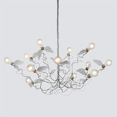 バーディは、宙を飛び回る12個の羽が生えた電球たちで構成されるシーリングランプ。電球が飛んできた軌跡のようにも見えるロッドは、1本ずつ手作業で螺旋状に巻かれています。空間のフォーカルポイントになる遊び心のあるデザインです。