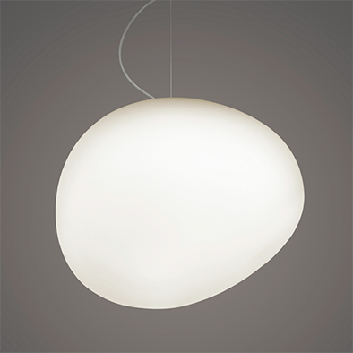 川を流れるうちに削られて丸みを帯びた石のようなフォルムのグレッグ。見る角度により表情を変えるアシンメトリーで詩的なデザインのシェードは、サテン仕上げのガラスでできています。どの高さや角度からでも光源が直接見えないため、やわらかくあたたかみがある光でまわりを照らします。有機的でシンプルな形は多灯吊りにも適しており、組み合わせ次第で生活空間でも公共の場でも、シーンや用途を問わずすっと溶け込みます。