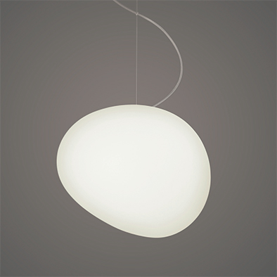 川を流れるうちに削られて丸みを帯びた石のようなフォルムのグレッグ。見る角度により表情を変えるアシンメトリーで詩的なデザインのシェードは、サテン仕上げのガラスでできています。どの高さや角度からでも光源が直接見えないため、やわらかくあたたかみがある光でまわりを照らします。有機的でシンプルな形は多灯吊りにも適しており、組み合わせ次第で生活空間でも公共の場でも、シーンや用途を問わずすっと溶け込みます。
