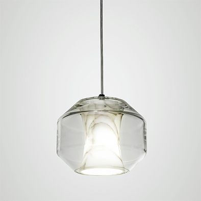 チェンバーライトは、透明度の高い有鉛クリスタルガラスのシェードの中に、彫刻のように削り出されたカララマーブルの筒が納められた照明です。自然素材の大理石だからこそ模様に個体差があり、大理石より滲みだすような光が柔らかいスポットライトのように辺りを照らします。