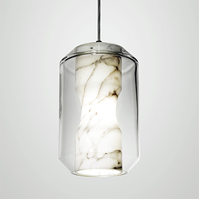 チェンバーライトは、透明度の高い有鉛クリスタルガラスのシェードの中に、彫刻のように削り出されたカララマーブルの筒が納められた照明です。自然素材の大理石だからこそ模様に個体差があり、大理石より滲みだすような光が柔らかいスポットライトのように辺りを照らします。