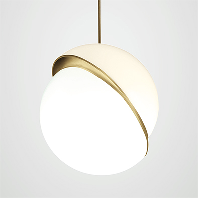 クレセントは、球体に切れ込みを入れてあえて断面を露出することにより、シンプルな“球体”という形状にアシンメトリーな新鮮さを与えたデザインが特徴です。月の満ち欠けをイメージしたこの照明は、乳白色の球と真鍮のコントラストが美しい、存在感と輝きを併せ持ったコレクションです。
