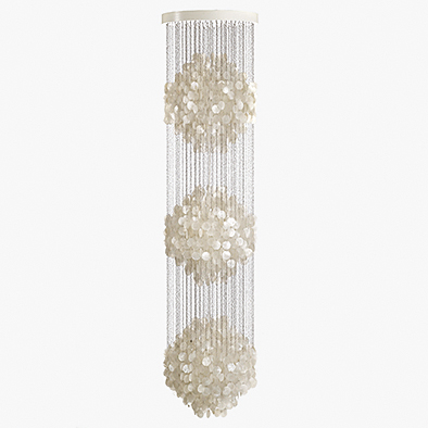 1964年にデザインされたファンは、光の陰影が魅力的な貝製の円形ディスクで構成されたモデルです。斬新なデザインのようで、クラシカルなクリスタルビーズ・シャンデリアのスタイルを採用。サイズバリエーションも豊富で、多様な空間を演出します。スペースエイジ・デザインを象徴する作品の一つです。