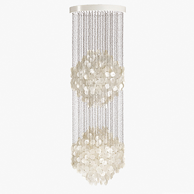 1964年にデザインされたファンは、光の陰影が魅力的な貝製の円形ディスクで構成されたモデルです。斬新なデザインのようで、クラシカルなクリスタルビーズ・シャンデリアのスタイルを採用。サイズバリエーションも豊富で、多様な空間を演出します。スペースエイジ・デザインを象徴する作品の一つです。
