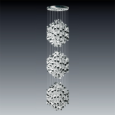 スパイラル・シリーズは、1970年のケルン国際家具見本市における伝説のインスタレーション「ヴィジョナ2」のために、ヴァーナー・パントンが1969年にデザインしたもので、彫刻的要素の高い作品です。螺旋状にねじられたアクリル板が作り出す、エレガントな煌きが印象的です。斬新なデザインのようで、クラシカルなクリスタルビーズ・シャンデリアのスタイルを採用しています。