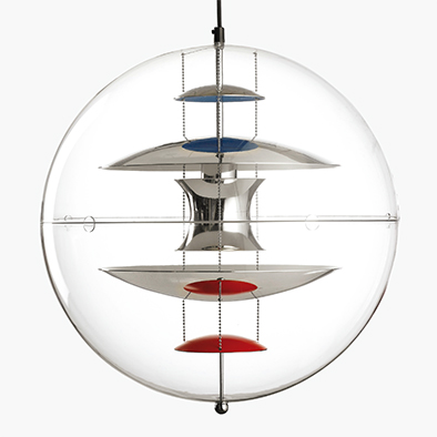 1969年、ヴァーナー・パントンによってデザインされた「VP グローブ」は、その圧倒的な存在感からスペースエイジ・デザインのアイコンとして特に人気の高い作品の一つです。透明なアクリルで包み込まれた5つのアルミ製のリフレクターは、内側をブルー、オレンジそしてホワイトに塗られ光を美しく制御します。
