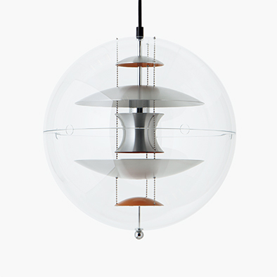 1969年、ヴァーナー・パントンによってデザインされた「VP グローブ」は、その圧倒的な存在感からスペースエイジ・デザインのアイコンとして特に人気の高い作品の一つです。透明なアクリルで包み込まれた5つのアルミ製のリフレクターは、内側をブルー、オレンジそしてホワイトに塗られ光を美しく制御します。