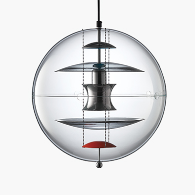 1969年にデザインされ、圧倒的な存在感の「VP グローブ」は、スペースエイジ・デザインを象徴する作品として、パントン作品の中でも特に人気の高い作品の一つ。透明なアクリルで包み込まれた5つのアルミ製のリフレクターは、内側をブルー、オレンジそしてホワイトに塗られ、光を美しく制御します。バリエーションの一つ「VPグローブカラードグラス」は大きいリフレクター2枚にスモークガラスを用い、よりクールな光を放ちます。