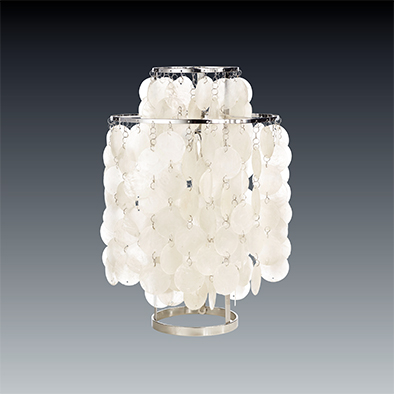 1964年にデザインされたファンは、光の陰影が魅力的な貝製の円形ディスクで構成されたモデルです。透過する光はやさしく、風に揺れると繊細な音を奏でてくれます。
