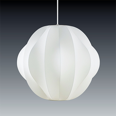 ニューヨーク近代美術館(MoMA)のコレクションとなっているバブルランプは、1952年ジョージ・ネルソンがデザインしました。細いスチールフレームに特殊なプラスチックをスプレーでコーティングする製作工程は当時と変わらず、シンプルなフォルムから幻想的な光を照らし出すその美しさは、ミッドセンチュリーデザインのファンのみならず、世界中のユーザーを半世紀経った現代も魅了し続けています。