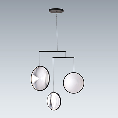 周囲の環境を織りなす「光・空気・風景」に焦点を当て、再構築を常に続けるフォーカス。モビール状にバランスを保つ薄く軽い平らなレンズが、窓からの自然光と室内の環境光を気流に身を委ねながら集光して拡散します。周囲の光が少ないときは、組み込まれた光源がレンズで切り取られた風景を囲み照らし、自分を取り巻く風景へと改めて意識を向けさせます。フォーカスは刻々と移り変わる環境に呼応してオブジェのような姿を現し、またとない光景を絶えず空間に作りだします。