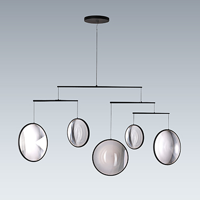 周囲の環境を織りなす「光・空気・風景」に焦点を当て、再構築を常に続けるフォーカス。モビール状にバランスを保つ薄く軽い平らなレンズが、窓からの自然光と室内の環境光を気流に身を委ねながら集光して拡散します。周囲の光が少ないときは、組み込まれた光源がレンズで切り取られた風景を囲み照らし、自分を取り巻く風景へと改めて意識を向けさせます。フォーカスは刻々と移り変わる環境に呼応してオブジェのような姿を現し、またとない光景を絶えず空間に作りだします。