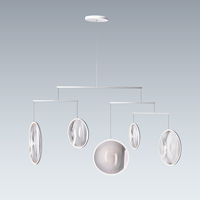 周囲の環境を織りなす「光・空気・風景」に焦点を当て、再構築を常に続けるフォーカス。モビール状にバランスを保つ薄く軽い平らなレンズが、窓からの自然光と室内の環境光を気流に身を委ねながら集光して拡散します。周囲の光が少ないときは、組み込まれた光源がレンズで切り取られた風景を囲み照らし、自分を取り巻く風景へと改めて意識を向けさせます。フォーカスは刻々と移り変わる環境に呼応してオブジェのような姿を現し、またとない光景を絶えず空間に作りだします。