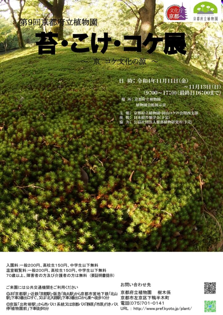 11月11日〜13日 京都府立植物園「苔・こけ・コケ展」 2022年11月10日 投稿者:lecielweb Mosslight-モスライト イベント情報 第9回「苔・こけ・コケ展」全国からコケ愛好家の方が集まります。日時:11月11日〜13日9:00~17:00(最終日16:00)場所:京都府立植物園 モスライトは、展示と販売をします。 京都府立植物園第9回「苔・こけ・コケ展」